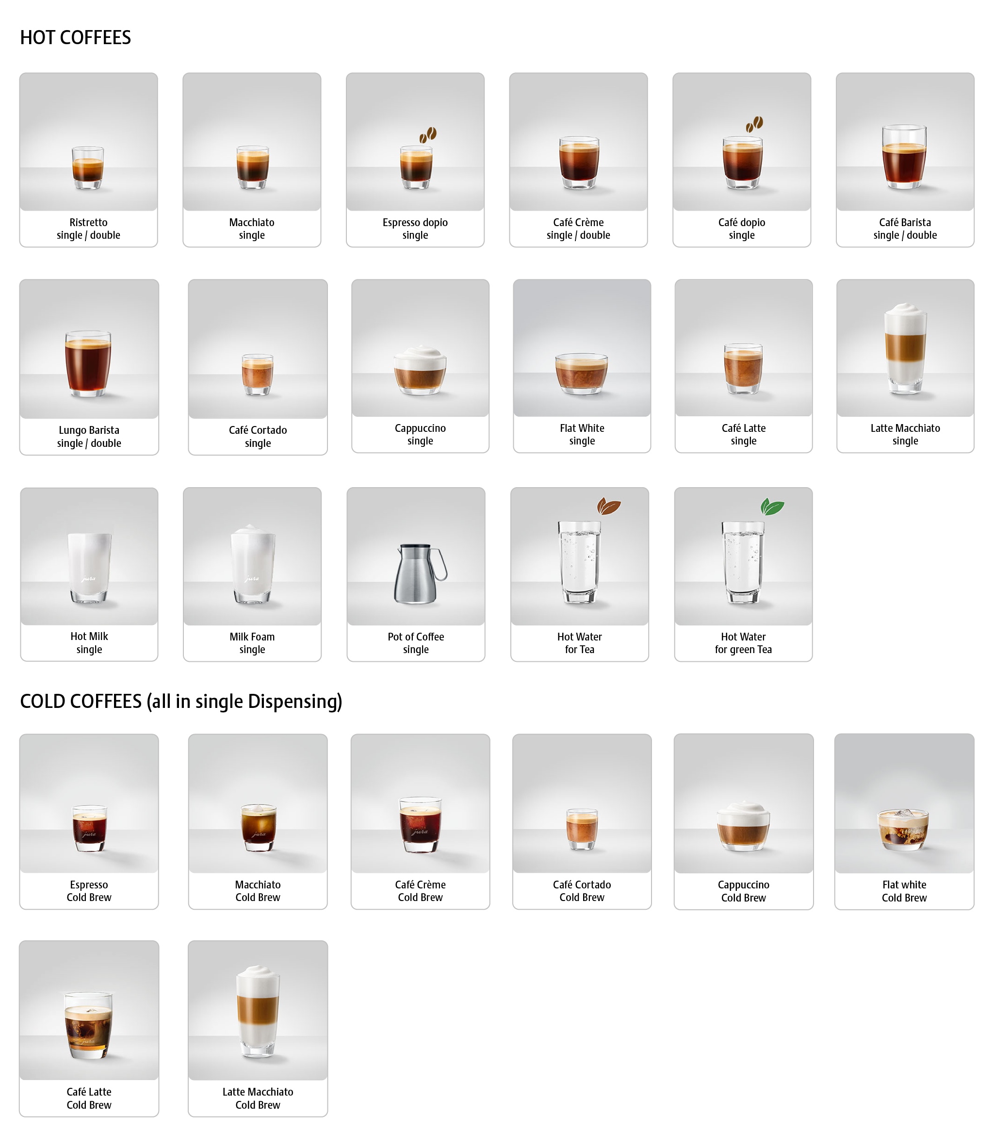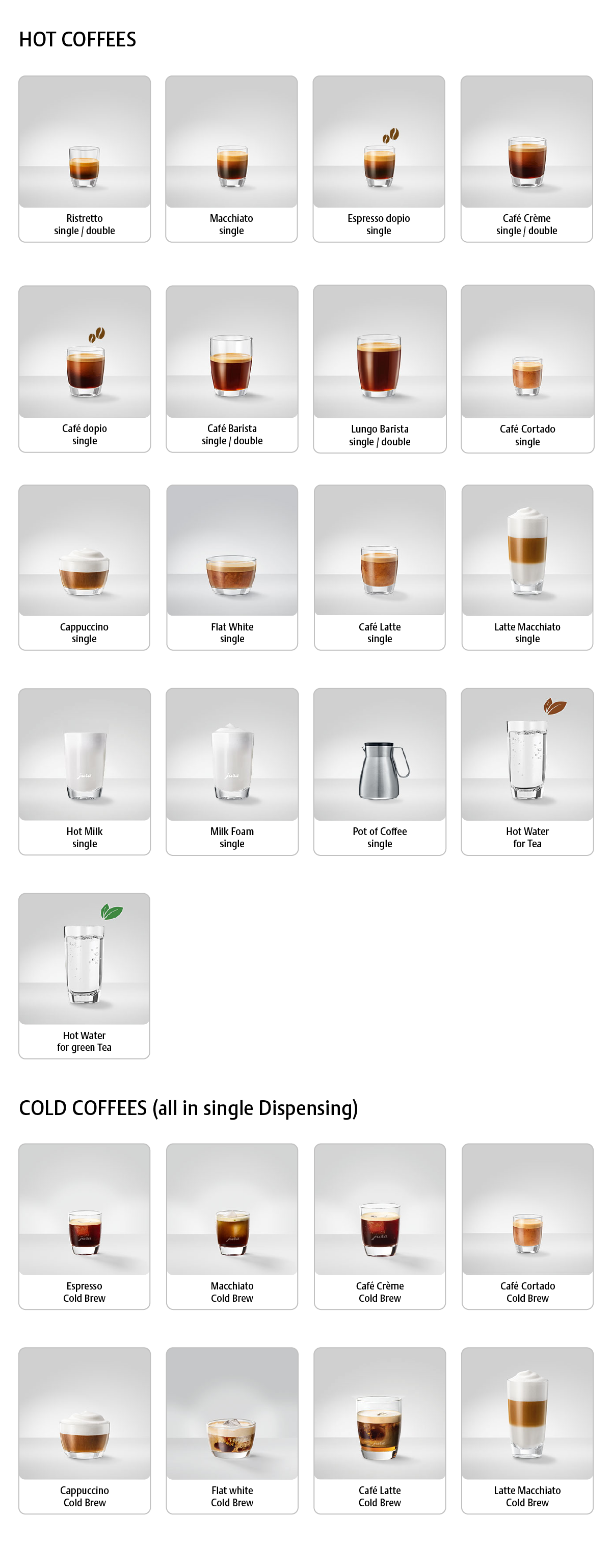 The JURA Z10 offers 40 different specialties – from an aromatic espresso to a trendy cappuccino. It can also prepare long, mild specialties such as caffè Barista. Those who like their coffee more intense can P.E.P. up their cappuccino, flat white or latte macchiato using the Extra Shot function. The JURA Z10 also prepares cold coffee at the touch of a button.